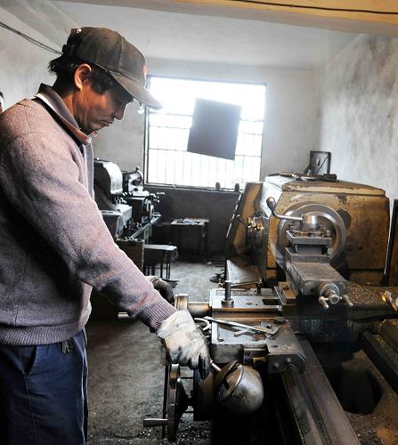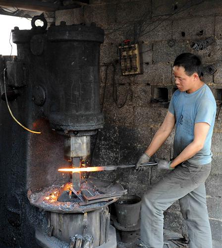 云南省曲靖市师宗县竹基镇良吉村一农民在加工农具(10月26日摄)。云南省曲靖市师宗县竹基镇的锻打铸造已有200余年的历史,全镇现有铸造厂(联营厂)20个,小作坊250个,汽锤140台,年均生产农具6000余万件(台),创造产值3000余万元,产品质优价廉,远销周边省市及老挝、缅甸等中南亚国家和地区,深受广大农户的欢迎,有些家庭靠生产农具年收入可达到10万元以上。新华社记者 杨宗友 摄