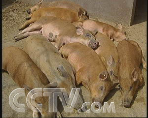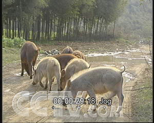 何少文:“这就是我们用野猪公猪和我们这里的中长白交配而成的猪,从生出来到可以出售也只有五六个月,你看它的耳朵,也跟野猪一样,嘴巴是尖尖的,它的尾巴也很细。”